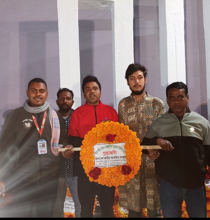 On Saturday (21 February) at 12:01 PM, Thakur Gaon Pir Ganj Upazila Central Shaheed Minar, Bangladesh National Journalist Forum Thakur Gaon District and Pir Ganj Upazila President Journalist Md. Mahfuzur Rahman General Secretary Md. Mosharraf Hossain Office Secretary Rezwanul Ferdous Riyad Member Md. Abu Bakkar Siddique Md. Monirul Islam Sujan laid wreaths in memory of language martyrs. Bangladesh National Journalist Forum Govt. Reg No. S 42199/18 journalist welfare and human rights organization Thakur Gaon district and Pir Ganj upazila branch paid deep respect to the martyrs.
