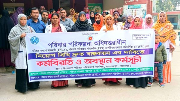 Strike and stay program to demand speedy implementation of recruitment rules in Palashbari- The family welfare assistants and family planning inspectors under the Directorate of Family Planning held a strike