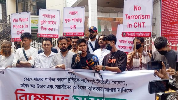 Calling the peace agreement a black agreement, CHT Sampriti Jot held a protest program at Jamal Khan square in Chittagong city on Tuesday. *CHT Harmony Alliance rally in Chittagong* *