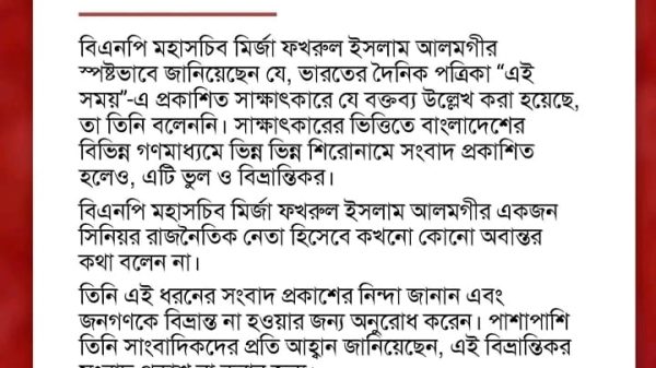 বিএনপি মহাসচিবকে নিয়ে “এই সময়” এর সাক্ষাৎকারটি ভুলভাবে উপস্থাপিত হয়েছে, যা বিভ্রান্তিকর। বিএনপি মহাসচিব মির্জা ফখরুল ইসলাম আলমগীর স্পষ্টভাবে জানিয়েছেন যে, ভারতের দৈনিক পত্রিকা “এই সময়”-এ প্রকাশিত সাক্ষাৎকারে যে বক্তব্য