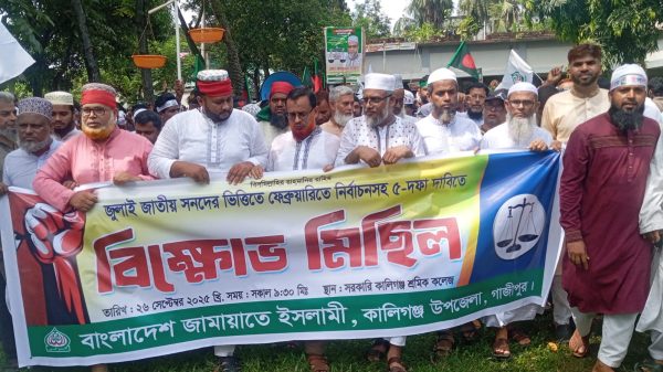 গাজীপুরে কালীগঞ্জে ৫ দফা দাবীতে জামায়াত ইসলামীর সমাবেশ ও বিক্ষোভ মিছিল জুলাই জাতীয় সনদের ভিত্তিতে এবং পিআর পদ্ধতিতে জাতীয় সংসদ নির্বাচনসহ ৫ দফা দাবীতে গাজীপুরের কালীগঞ্জে সমাবেশ ও বিক্ষোভ মিছিল